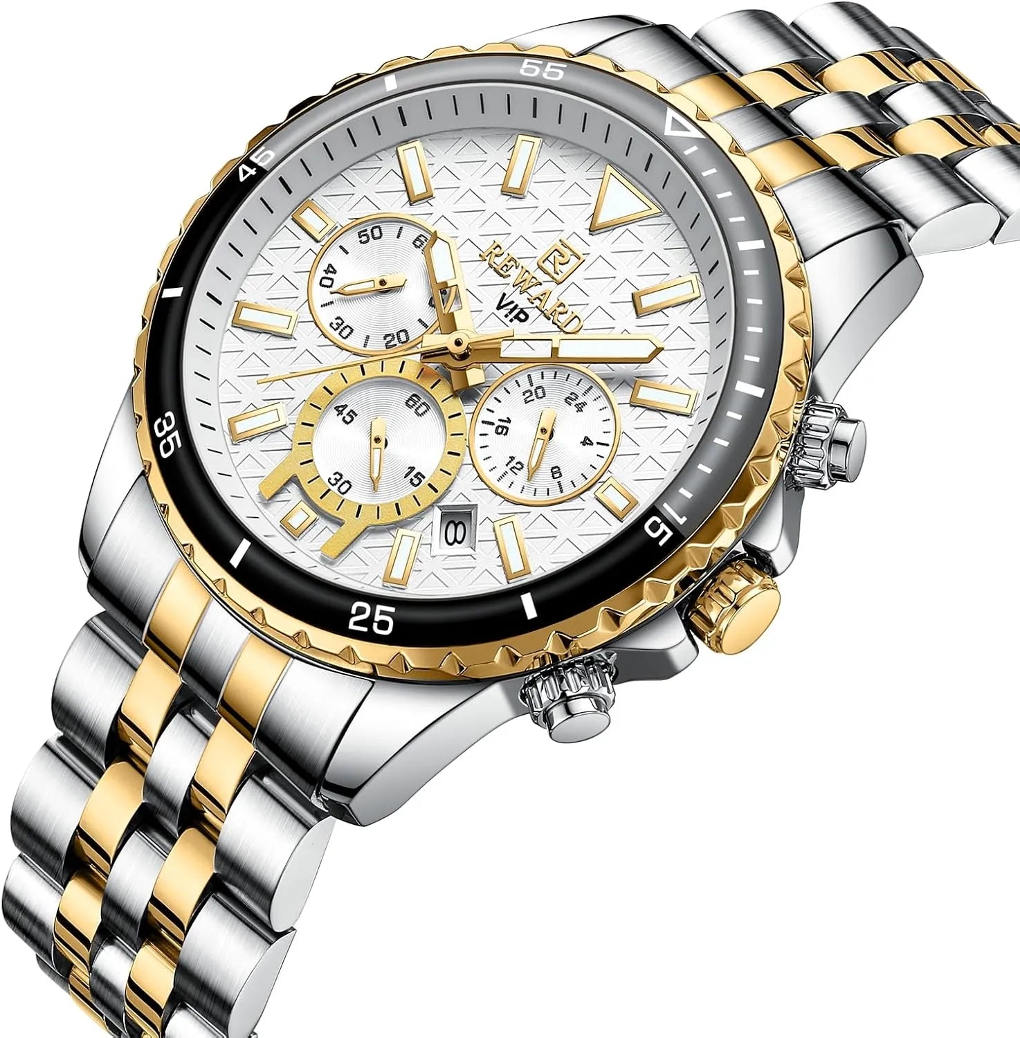 ساعة يد رجالية فاخرة من REWARD، كوارتز ذهبي وأبيض - مضيئة، متعددة الوظائف، حزام من الفولاذ المقاوم للصدأ، مقاومة للماء حتى عمق 30 مترًا، مثالية للرجل الأنيق ورجال الأعمال والملابس الكاجوال، ساعة فاخرة